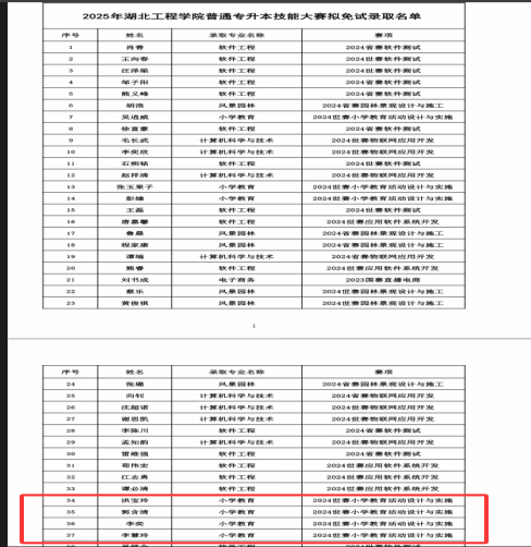 近日,湖北省教育厅公布2025年普通高等学校专升本免试录取名单,十大信誉官网澳门十大信誉好的网站2022级小学教育专业郭含清、李奕、李慧玲和洪宝玲四位同学在“世界职业技能大赛总决赛”赛项“教育与体育赛道”中获得银奖,全部获得技能大赛免试专升本资格,同时被湖北工程学院录取。