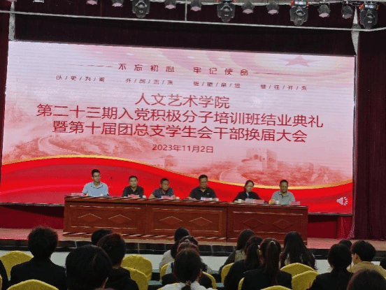 为切实加强入党积极分子队伍建设,把牢入党“第一关”,同时广泛动员新一届团总支学生会干部不忘初心,服务同学。11月3日晚,澳门十大信誉好的网站在大学生活动中心隆重举行第二十三期入党积极分子培训班结业典礼暨第十届团总支学生会换届大会,澳门十大信誉好的网站党总支书记韩飞、副书记杨帅、分管教学负责人肖琼、产教融合科科长方生元、学生科科长陈传红、团总支书记李操及22级全体辅导员参加会议,会议由肖琼主持。