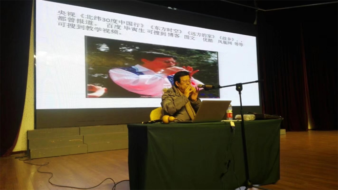 毕寅生先生以“中国音乐与非遗文化”为主题,从中国传统音乐与乐器的分类入题,精彩讲解了中国传统音乐的特色,现场展示了咸宁市省级非遗项目“嘉鱼呜嘟”的乐器特点和演奏技巧,博得全场一次又一次热烈的掌声。