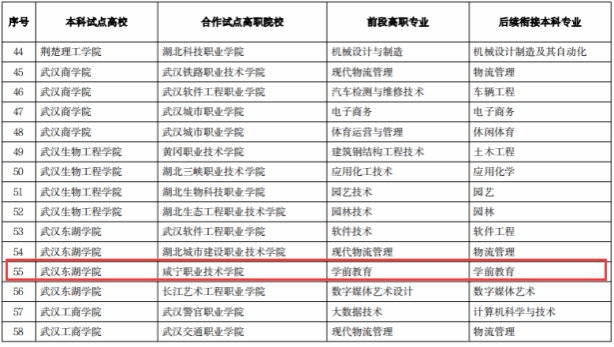 根据《省教育厅关于开展新一轮普通本科高校与高职院校联合培养技术技能型人才试点工作的通知》(鄂教高函〔2024〕8号),经高职院校自愿申报、本科高校遴选并联合高职院校申请,湖北省教育厅审核公示,2024年5月,澳门十大信誉好的网站成功携手武汉东湖学院,通过“3+2”分段制,专本联合培养学前教育专业新型技能型人才。