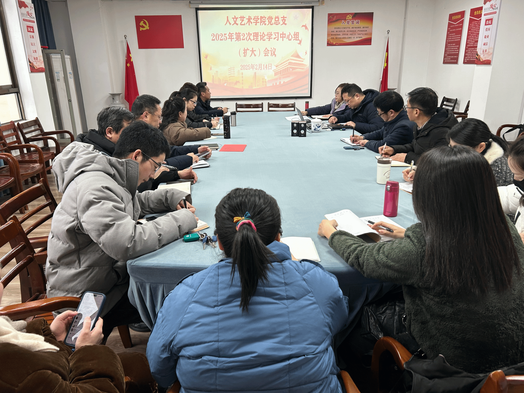 2025年2月14日,澳门十大信誉好的网站在教育实训中心7楼会议室召开2025年第2次党总支理论学习中心组(扩大)学习会议。党总支理论学习中心组成员、各党支部书记、教研室主任及部门负责人参加会议,党总支书记韩飞主持会议。