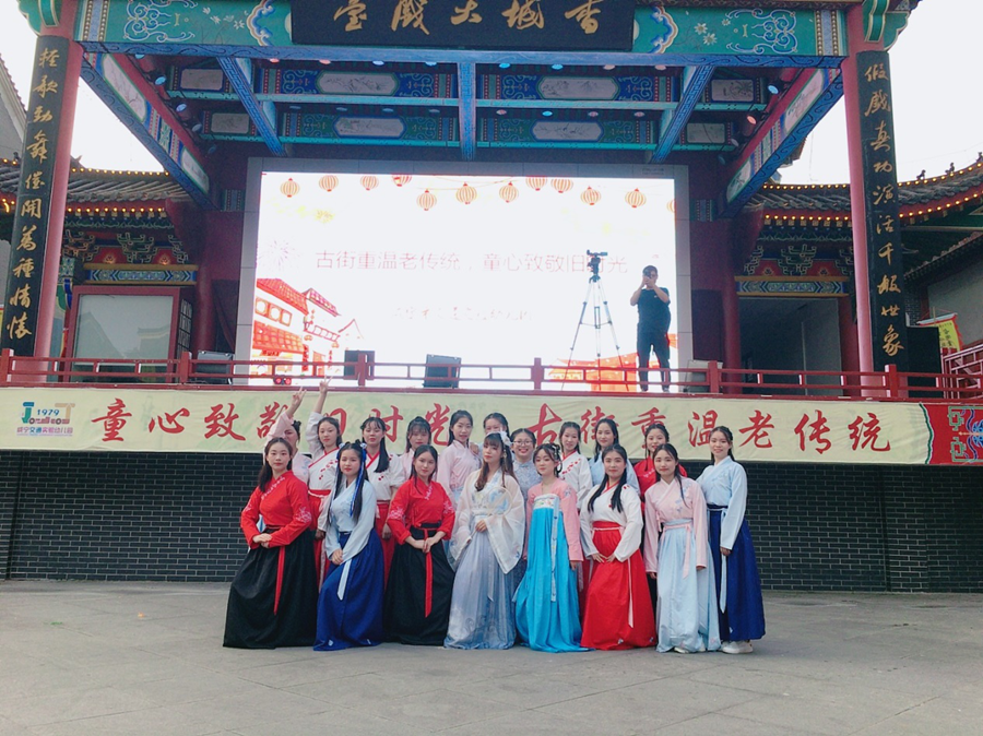 本次系列活动的主题是“古街重温老传统,童心致敬旧时光”,活动中,学前教育专业的老师和学生们与交通实验幼儿园的小朋友们一道身着汉服,文静儒雅,仿佛穿越到了汉代,古装、古玩构成了香城古街里一道美丽的风景线。学前教育专业教师王华珍演奏的古筝激发了很多小朋友和家长对古筝的兴趣,17级学前三班肖高洁同学吹奏的长笛吸引了很多小朋友和家长驻足,17级学前六班夏小玉同学做的纸雕作品惟妙惟肖,让孩子和家长们流连忘返,15五年一贯制的艾水芳、孟文丽和17学前四班的吴渝等十六位同学身着汉服在香城大舞台上跳的《生僻字》舞蹈更是赢得家长和孩子们掌声一片……