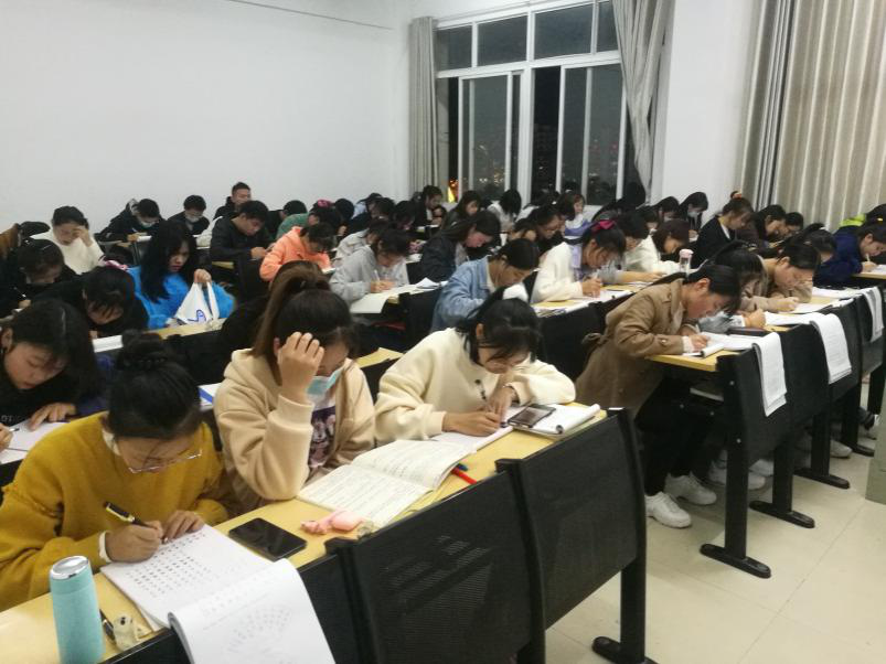 学生们晚间在教室刻苦练字(二)