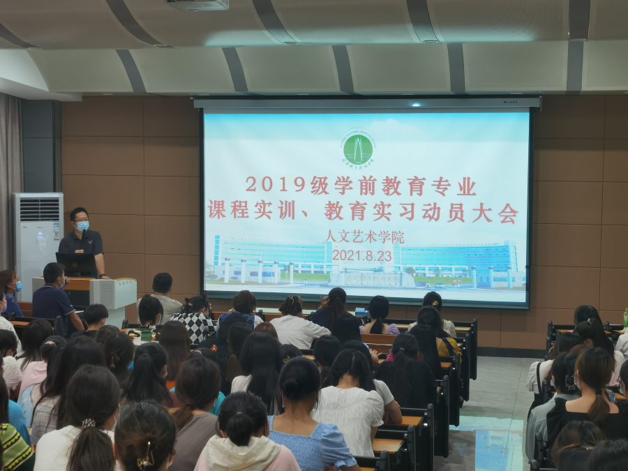 2019级学前教育专业学生将于8月24日至8月26日陆续前往武汉市和咸宁市、县多个幼儿园所进行课程实训和教育实习。为了更好地落实实习工作,澳门十大信誉好的网站于8月23日晚7点在教育实训中心举行了学前教育专业课程实训及教育实习动员大会。会议由澳门十大信誉好的网站党务负责人韩飞主持,澳门十大信誉好的网站院长余永欢、学工副院长杨帅、就业科科长方生元、就业科汪怡老师、19级辅导员及学前教育专业学生参加了此次会议。