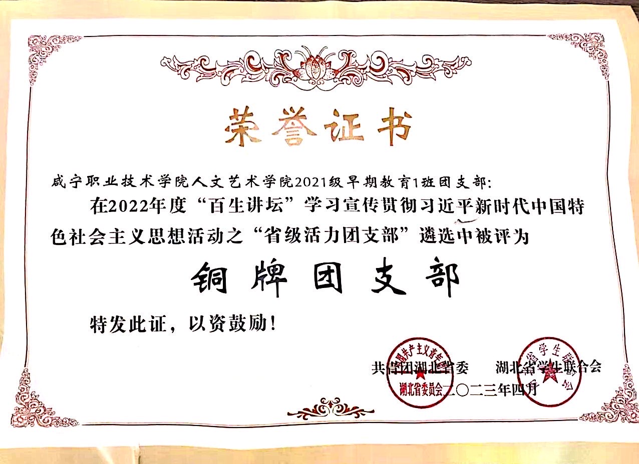 近日,湖北省2022年度“百生讲坛”学习宣传贯彻习近平新时代中国特色社会主义思想活动之“省级团支部”评选结果揭晓,澳门十大信誉好的网站澳门十大信誉好的网站2021级早期教育1班团支部通过层层筛选和审核,成功晋级到省级比赛,最终获得“铜牌团支部”称号。